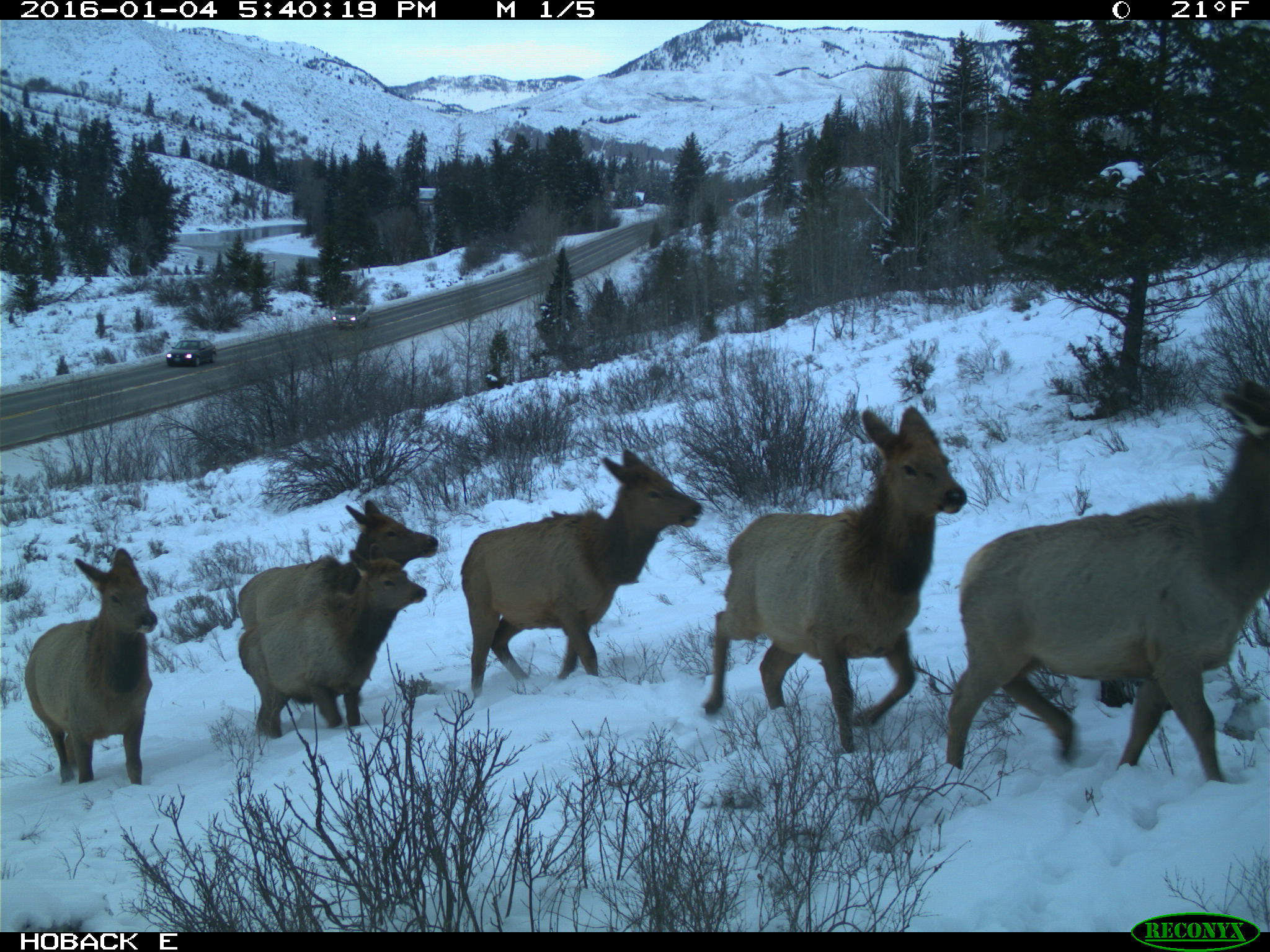 Elk moving from a planned wildlife underpass site on a 4/5 lane highway construction project south of Jackson, WY. Camera trap: Greater Yellowstone Coalition, JH Wildlife, JH Conservation Alliance, Center for Large Landscape Conservation, YtoY Conservation, working with WY Game & Fish, WYDOT, USFS.