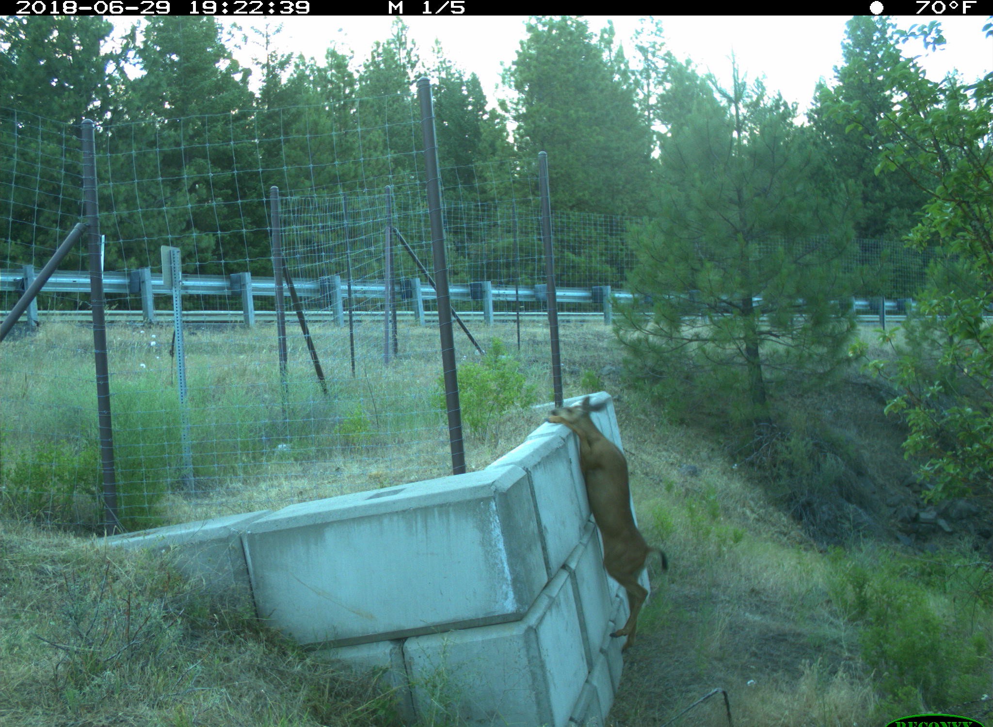 WSDOT completed a fish barrier correction project by replacing a culvert with a bridge. Fencing, wildlife guards and jumpouts were part of the project. This deer was making a valiant attempt to enter the right-of-way using a jumpout. Fortunately, it appears to have been a failed attempt.
