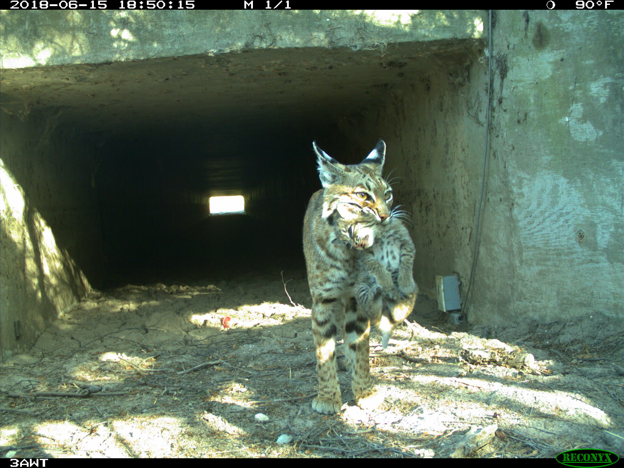 Upload Image Contest Category Roads and Rail Subject in the image (for example animal common name) Bobcat and kitten exiting wildlife crossing structure. Your Name and Organization T. Miles Hopkins, University of Texas Rio Grande Valley Story behind the photo Bobcat carrying its kitten through a wildlife crossing structure on state highway 100, Cameron County, Texas.